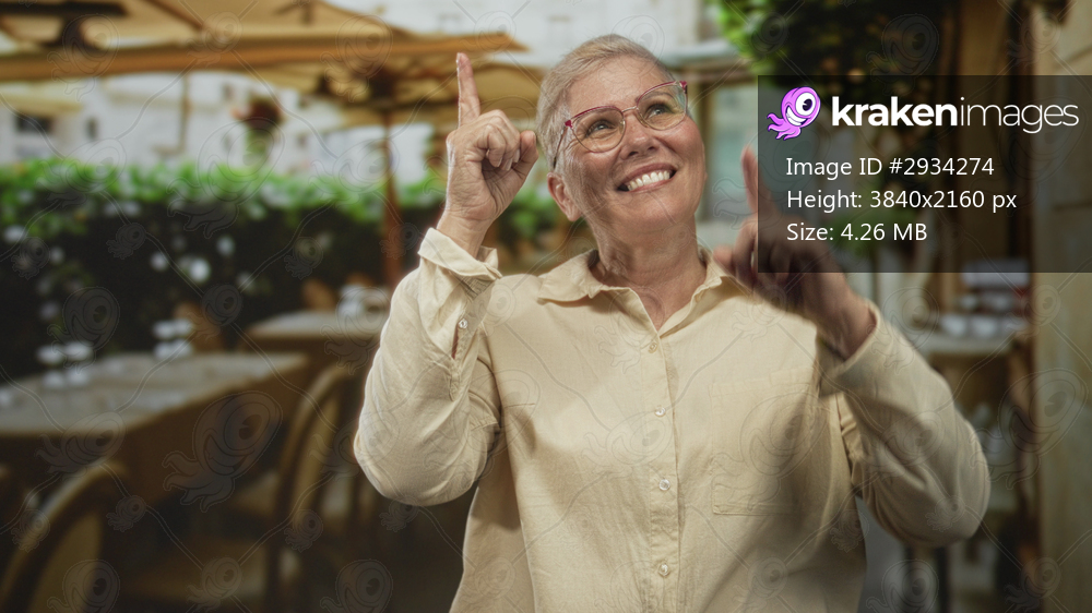 Woman points index fingers up on street terrace beside cafe tables, wearing glasses and smiling; joy celebration.