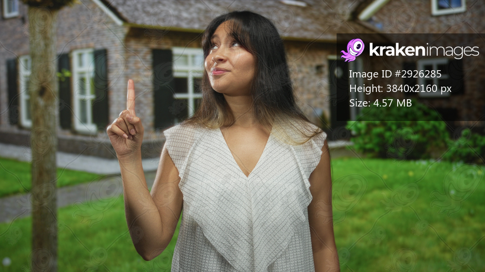 Woman points index fingers upward at house entrance in front of a brick building outdoors; playful curiosity.