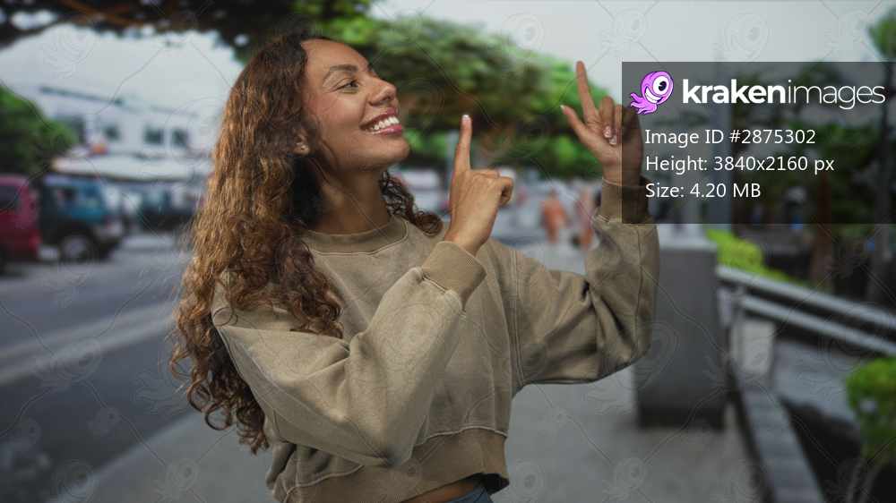 Woman points index fingers upward beside a sidewalk railing on a busy city street smiling and looking at her hands; joy discovery.