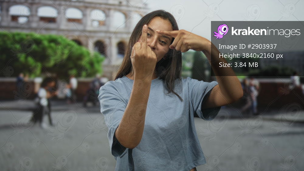 Woman points middle finger in front of colosseum building on a crowded rome street, hands framing gesture; defiance attitude.