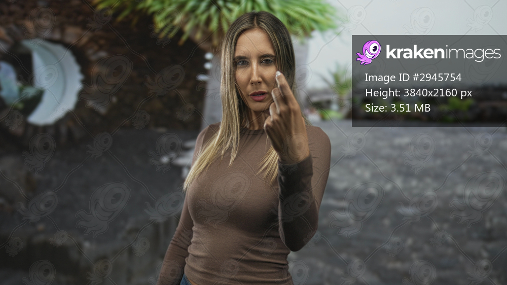 Woman points pen to camera on street with extended hand and serious face, direct stare; assertive challenge.