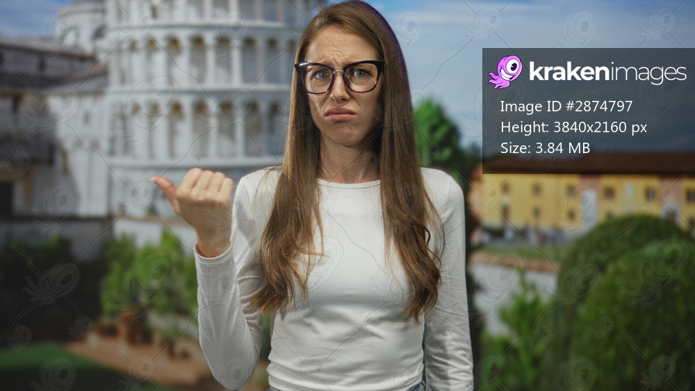 Woman points thumb at leaning tower building in pisa with a disgusted grimace; travel frustration annoyed.
