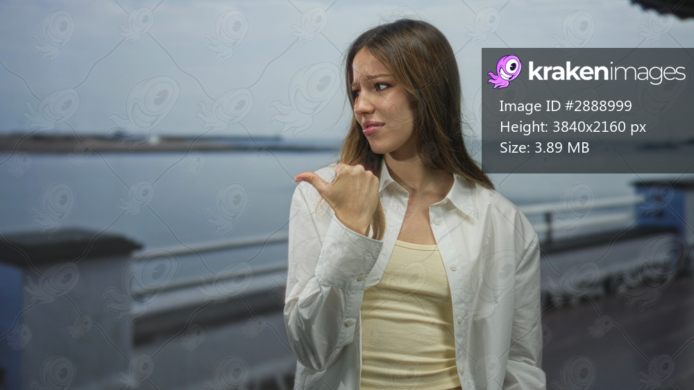 Woman points thumb over her shoulder on seaside promenade street, visible hand and thumb with uneasy facial expression; doubt hesitation refusal.