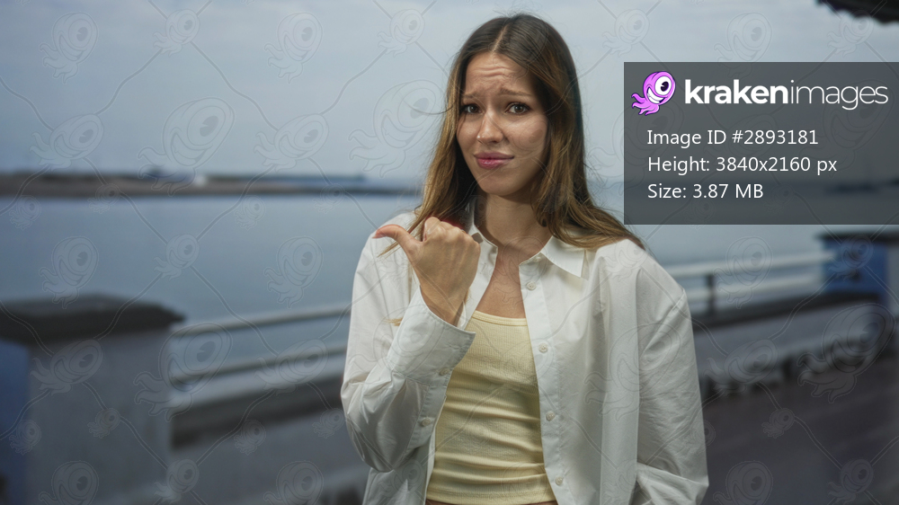 Woman points thumb over her shoulder on seaside promenade street, visible hand and thumb with uneasy facial expression; doubt hesitation refusal.