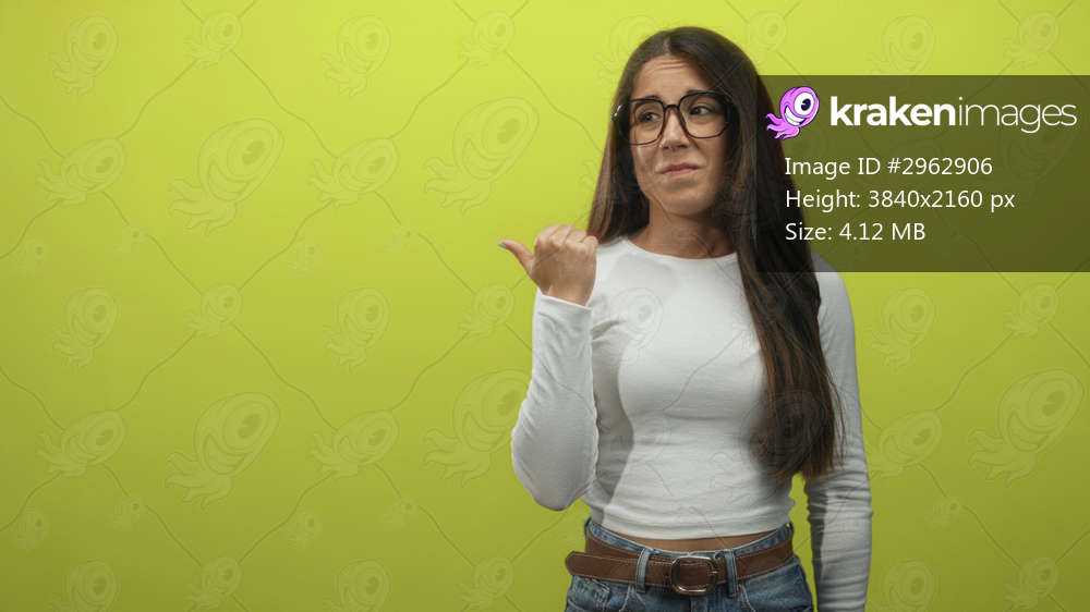 Woman points thumb over shoulder in bright lime studio, long hair and glasses, white long sleeve top and jeans belt visible; skepticism.