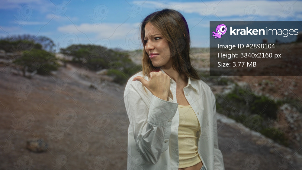 Woman points thumb over shoulder in forest path, frowning with puzzled expression; doubt hesitation uncertainty.