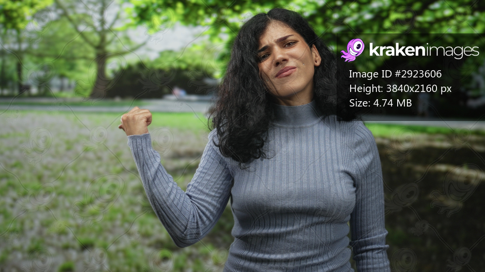 Woman points thumb over shoulder toward forest path while squinting and frowning, visible hand gesture and facial expression show unsure attitude; skepticism. - Kraken Images
