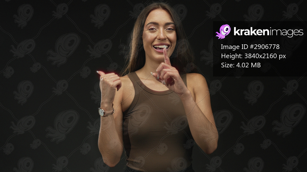 Woman points thumb over shoulder while smiling and wearing sleeveless brown top in a black studio; confidence empowerment.