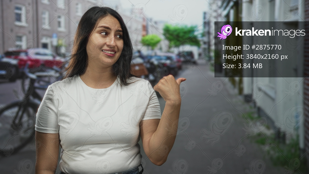 Woman points thumb to city street while glancing sideways with a puzzled expression; skepticism uncertainty.