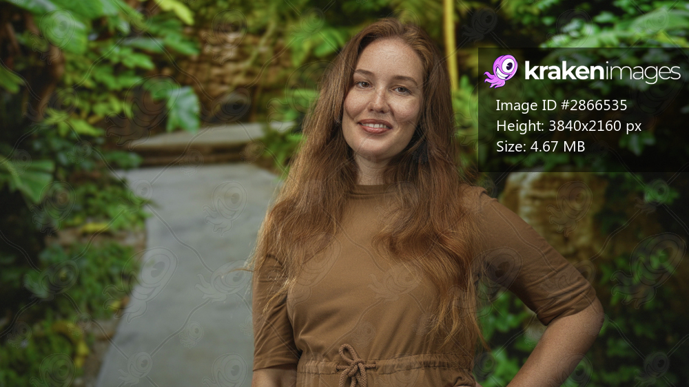 Woman points thumb to green park path lined with dense leafy plants and mossy stones under morning light; confidence.