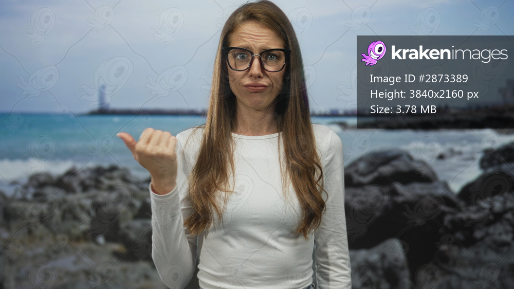 Woman points thumb to shore in studio portrait, looking puzzled with glasses and long hair wearing white long sleeve top; skepticism hesitation.