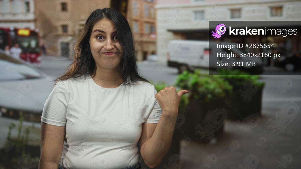 Woman points thumb to street beside parked cars and large planters while smirking at passing traffic; casual dismissal.