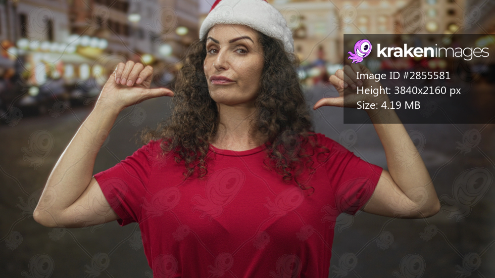 Woman points thumbs at her chest wearing a santa hat on a city street decorated with lights and blurred buildings; confidence.