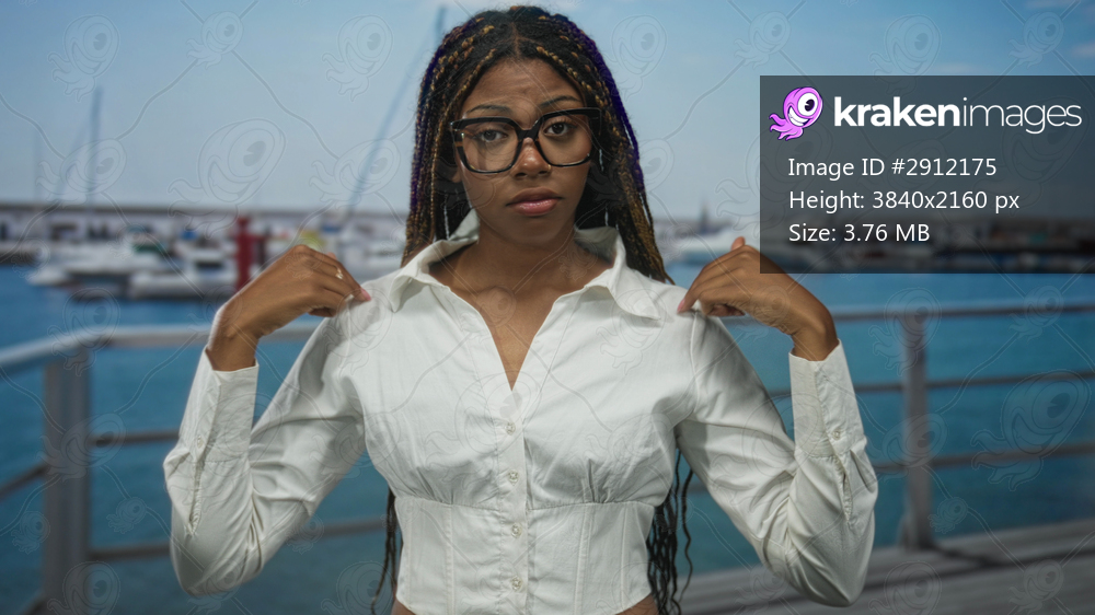 Woman points thumbs to chest at port boardwalk wearing white blouse and glasses, braids visible; confidence.