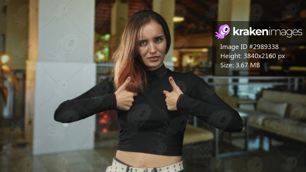 Woman points thumbs to chest in building wearing black crop top showing midriff and studded belt, stern gaze; self assertion defiance.