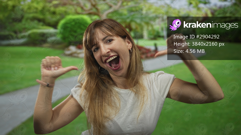 Woman points thumbs to chest in park while smiling and laughing with open mouth; self confidence joy.