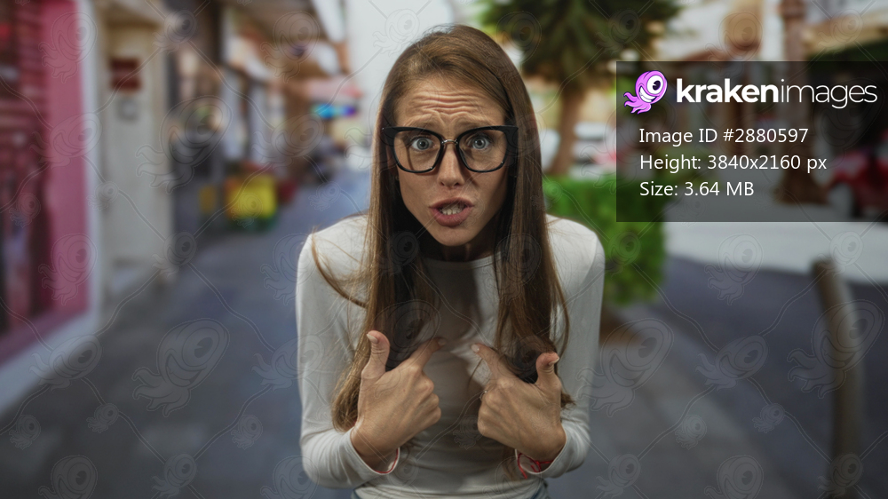 Woman points thumbs to chest on a crowded city street wearing glasses and white top and long hair, expressive face and open mouth questioning gesture; confusion doubt. - Kraken Images