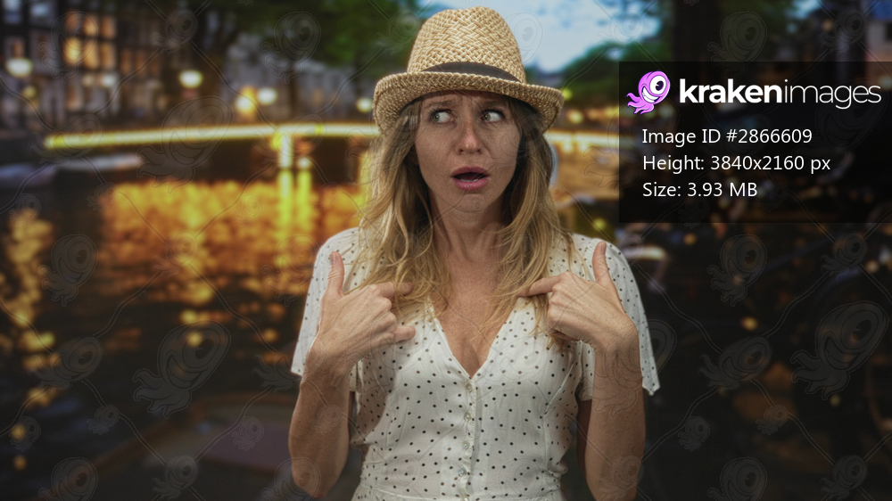 Woman points thumbs to chest on amsterdam canal street, wearing straw hat and polka dot dress; surprise self doubt.