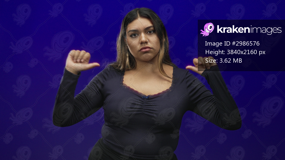 Woman points thumbs to her chest, visible cleavage and upright posture in a studio portrait with deep blue backdrop; self confidence.
