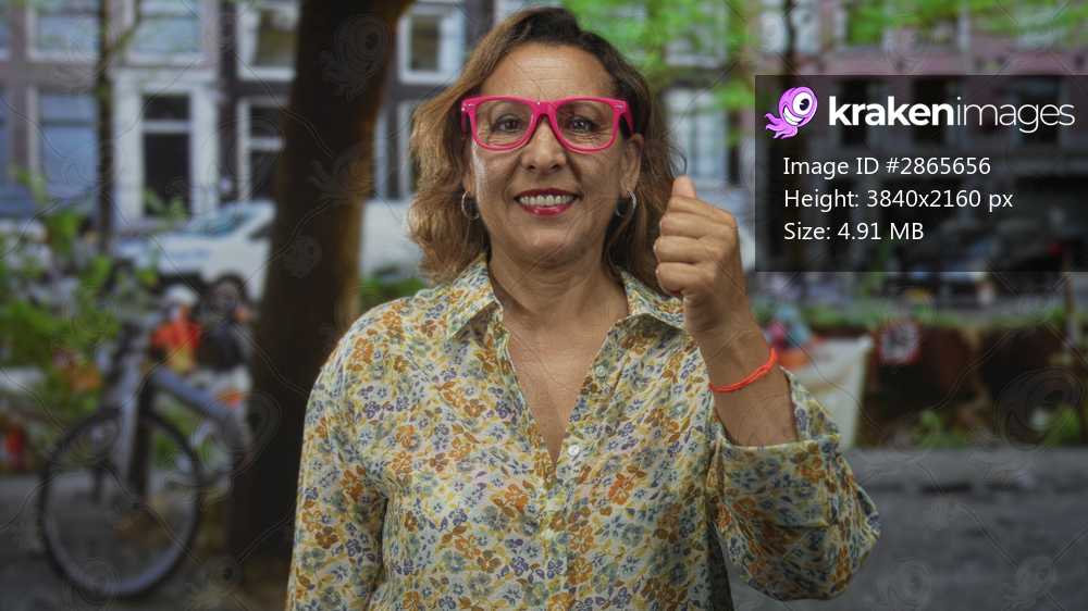Woman points to bright pink glasses on street with smiling expression and building visible behind; confidence.
