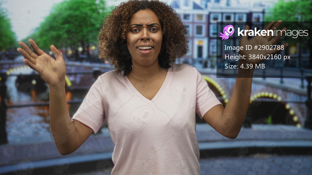 Woman points to chest and raises hands on a street by an amsterdam canal bridge with buildings and trees visible; confusion doubt.