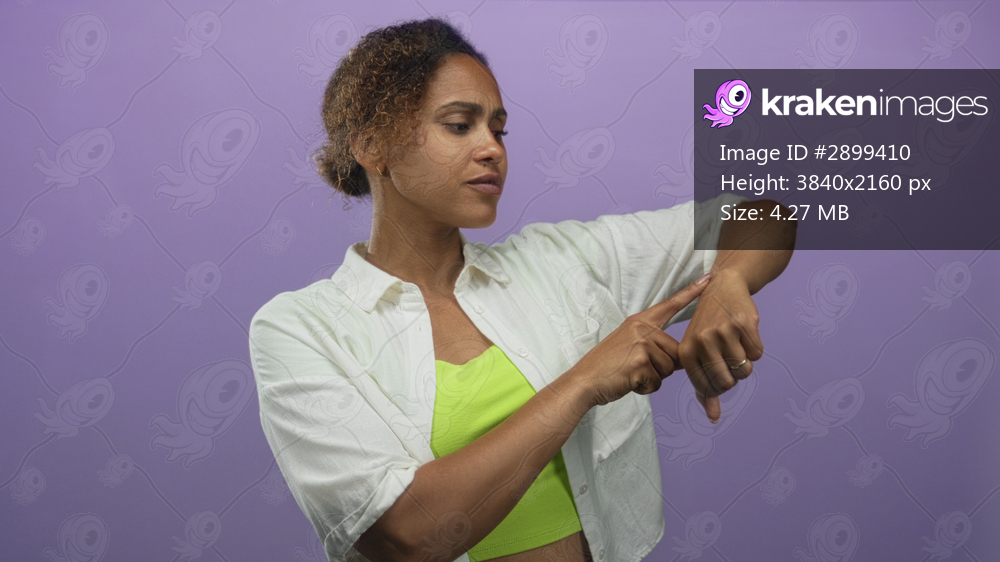 Woman points to wrist in studio purple set, wearing white shirt and neon green top with finger indicating bare wrist and slight frown; impatience urgency. - Kraken Images