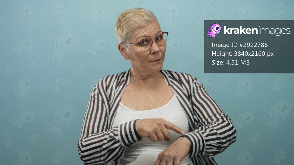 Woman points to wrist on blue studio backdrop, wearing striped shirt and glasses; impatience punctuality.