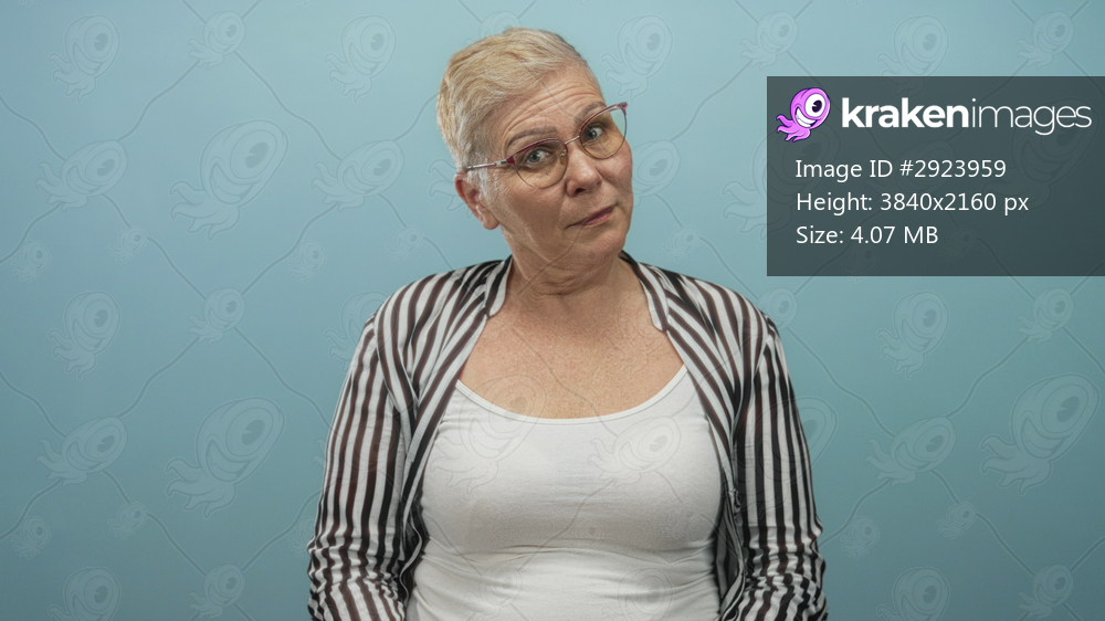 Woman points to wrist on blue studio backdrop, wearing striped shirt and glasses; impatience punctuality.