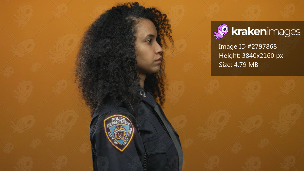 Woman police officer in uniform stands against an isolated orange background wall looking focused and professional in her role.