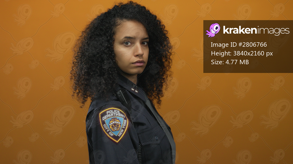 Woman police officer in uniform stands against an isolated orange background wall looking focused and professional in her role.