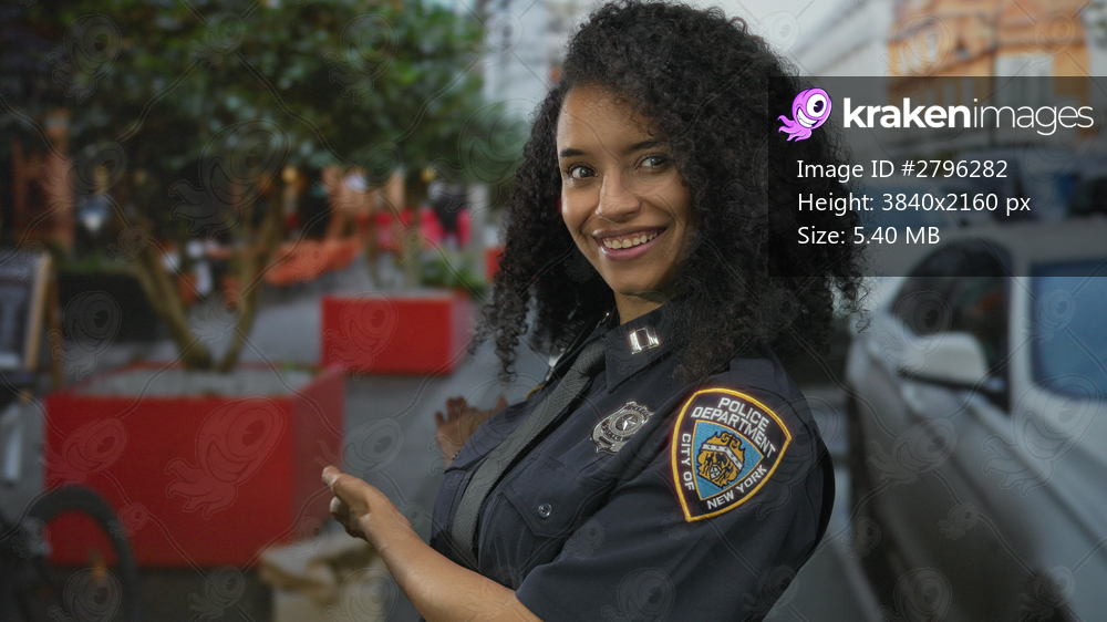 Woman police officer smiles and extends hands backward displaying badge on new york street; public service.
