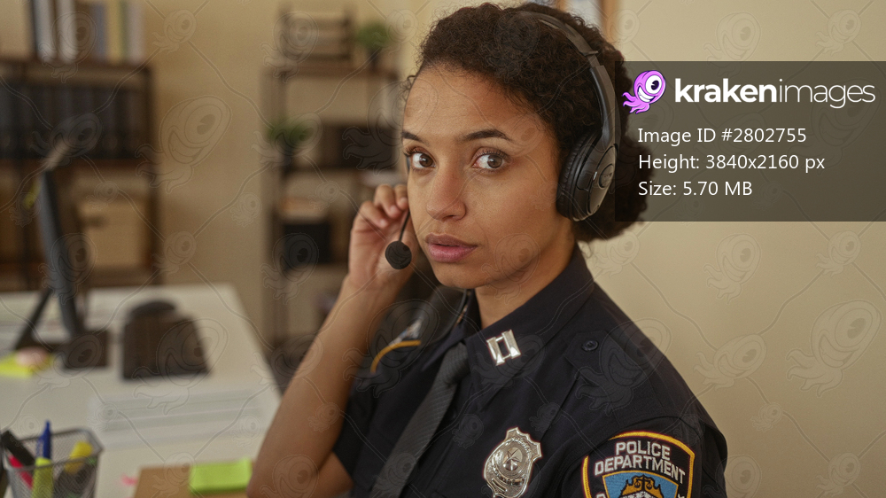 Woman police officer wearing headset in uniform at a desk in a police station office interior, focused and communicating while performing duties.