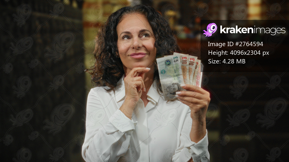 Woman pondering british pound banknotes inside a church, depicting financial contemplation in a religious setting, highlighting a middle-aged female indoors with curiosity and money. - Kraken Images