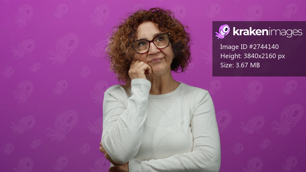 Woman pondering with chin rested on hand in front of a vibrant pink wall showing thoughtful expression wearing glasses