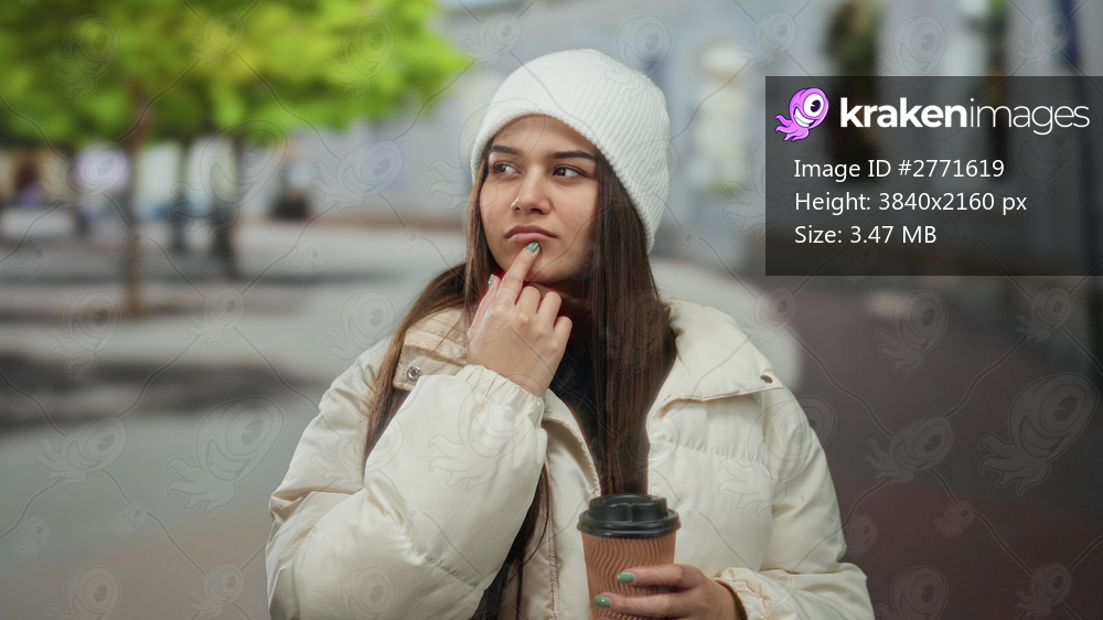 Woman pondering with coffee cup outdoors wearing beanie showing thoughtful expression in city street during a chilly autumn day with vibrant green trees in background - Kraken Images