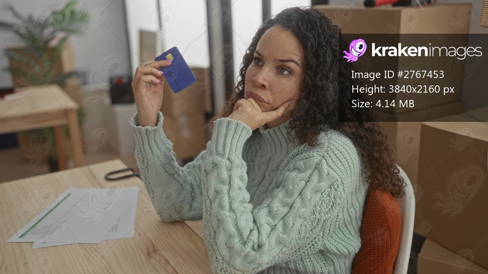 Woman pondering financial decisions in a new apartment surrounded by boxes, holding a credit card at a desk indicating recent relocation and personal budgeting. - Kraken Images