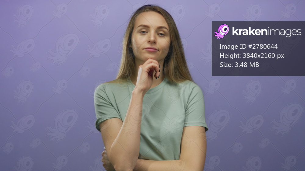 Woman pondering with hand on chin against a solid purple background, expressing thoughtful expression, wearing casual attire and conveying a theme of contemplation and introspection. - Kraken Images