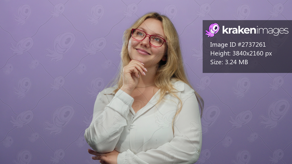 Woman pondering with hand on chin, wearing glasses and white blouse, smiling against a purple background, suggesting deep thought and creativity in a studio setting. - Kraken Images