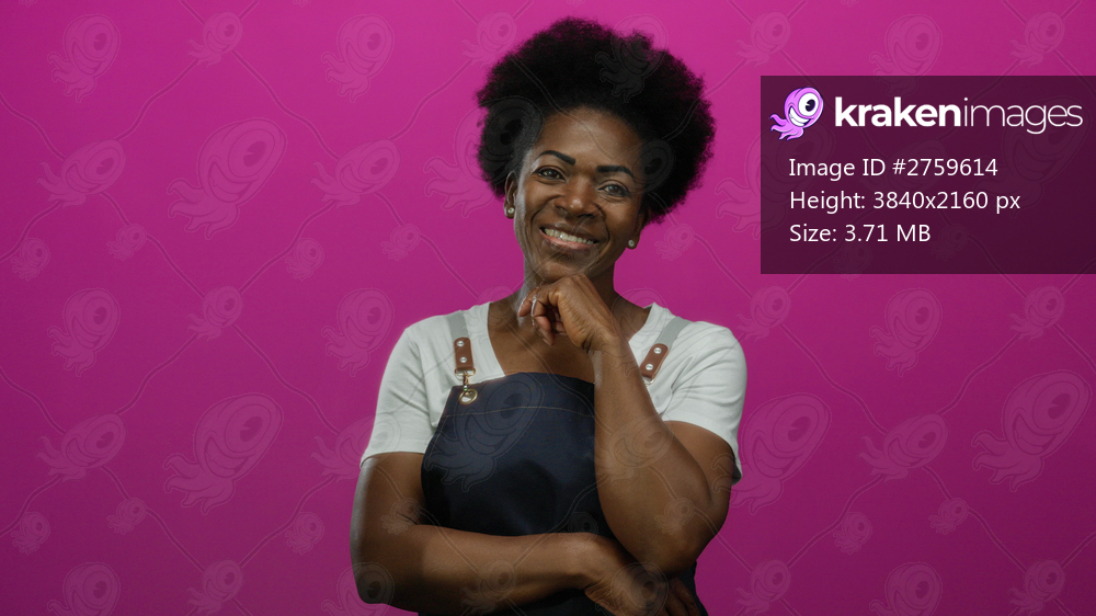 Woman pondering in apron against isolated pink background, displaying thoughtful expression and hand on chin suggesting creativity and contemplation with african american charm - Kraken Images