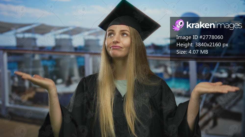 Woman pondering in graduation gown on cruise boat in port showcasing decision making moment under sunny outdoor sky
