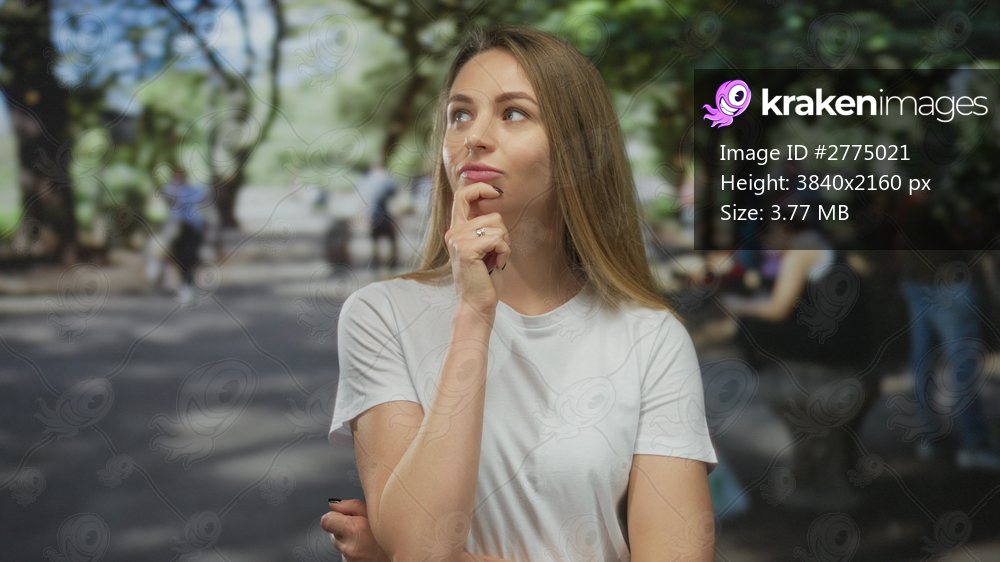 Woman pondering in sunny park surrounded by trees and people creating a thoughtful and serene ambiance of contemplation outdoors.