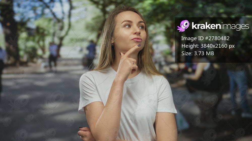 Woman pondering in sunny park surrounded by trees and people creating a thoughtful and serene ambiance of contemplation outdoors.