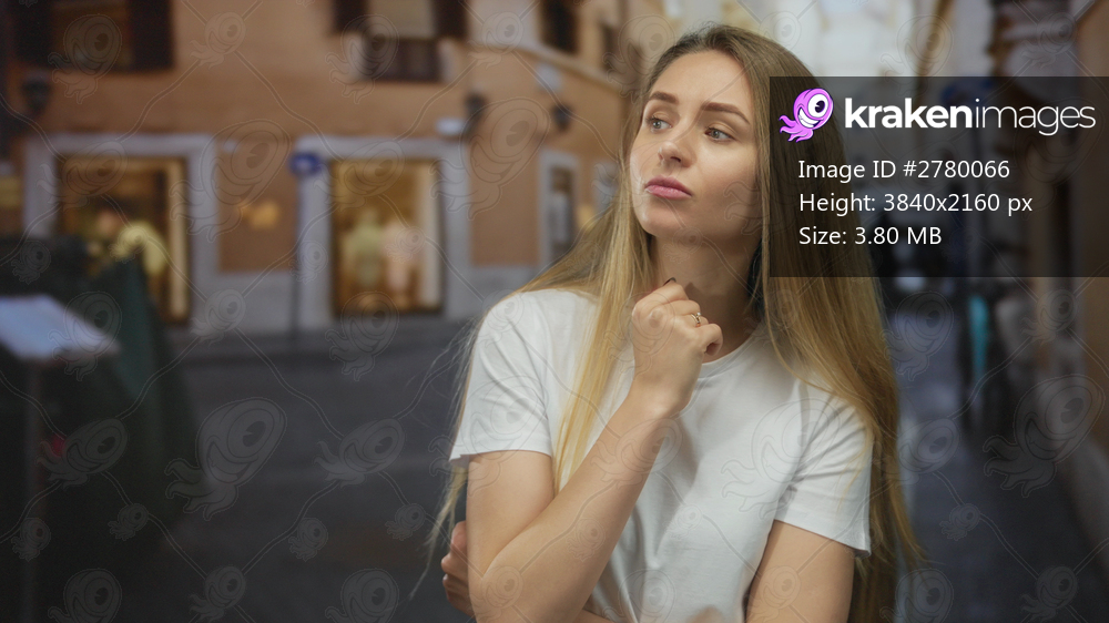 Woman pondering on a city street with long hair in a casual setting, exuding a thoughtful mood and casual fashion against a blurred urban backdrop in the background. - Kraken Images