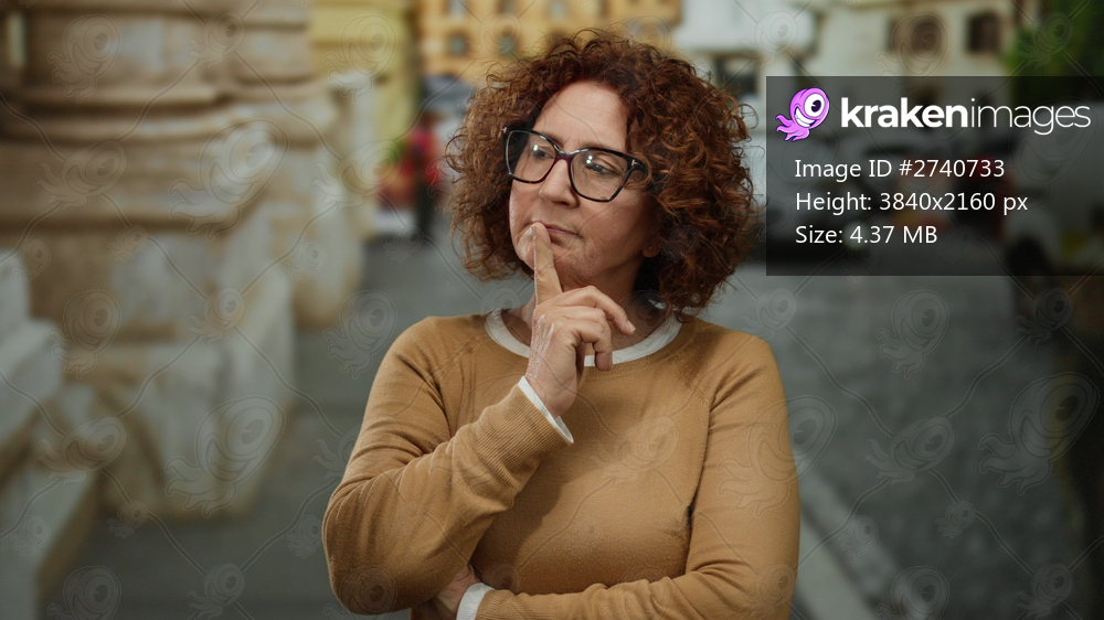 Woman pondering on a city street, wearing glasses and brown sweater, with cars and buildings in the blurred background during daytime.