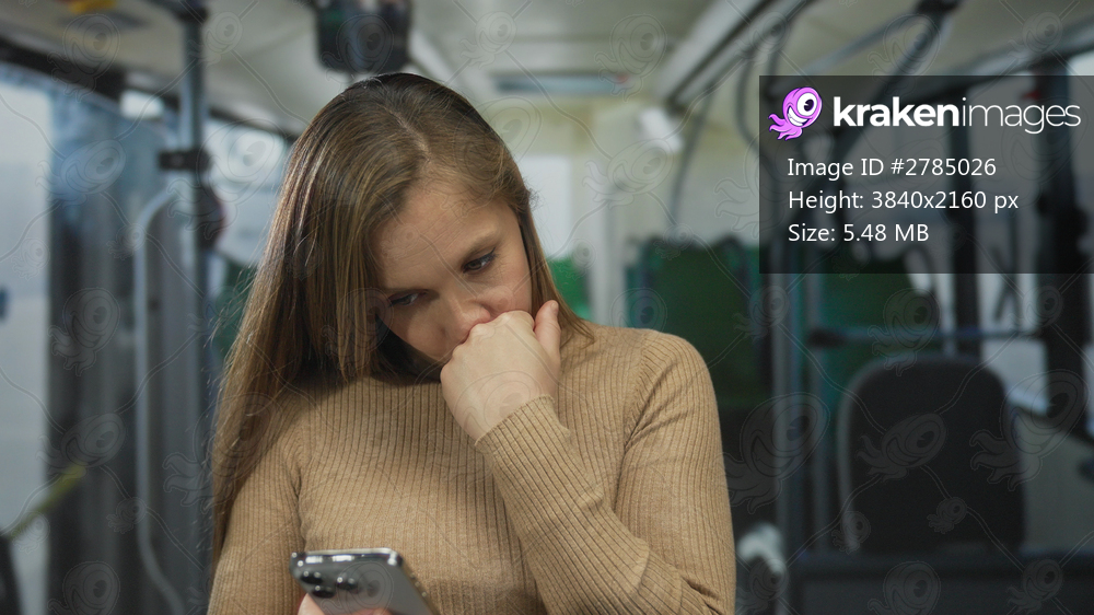 Woman pondering on bus with smartphone indoors looking thoughtful while wearing tan sweater.