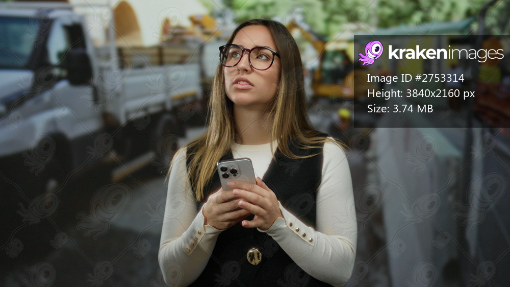Woman pondering on smartphone at bustling construction site with trucks and workers in background, showcasing modern communication amidst traditional industrial setting. - Kraken Images