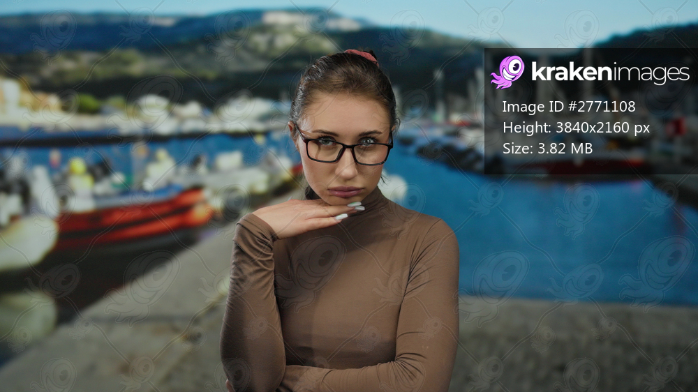 Woman pondering outdoor near a port with boats in the background, wearing glasses and brown top, with mountains visible, suggesting a thoughtful moment. - Kraken Images