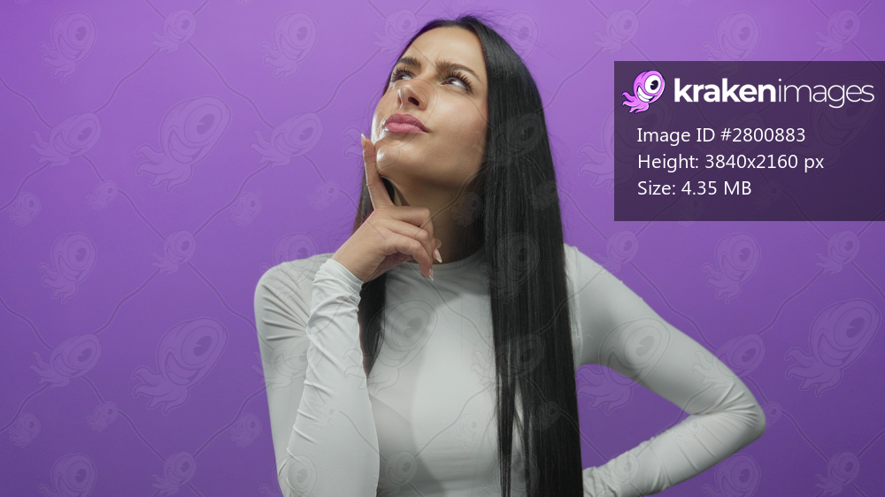 Woman pondering over isolated purple background wearing white shirt showing thoughtful expression.
