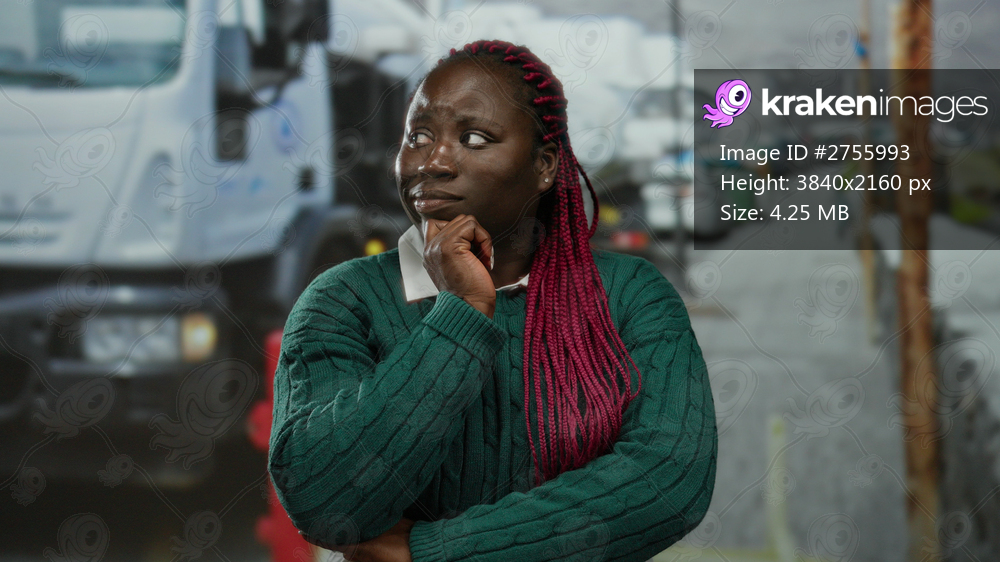 Woman pondering with pink braids on city street next to a truck in an outdoor urban setting, wearing a green sweater, displaying a thoughtful expression. - Kraken Images