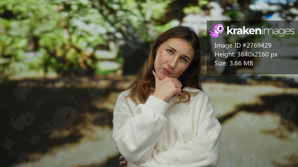 Woman pondering thoughtfully in sunny park outdoor setting with lush trees surrounding her wearing casual white sweatshirt during daytime.